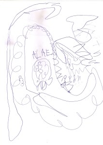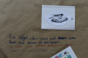 „Ein Vogel, der sitzt auf einem alten Buch und drinne ist eine Feder. Er will seine Feder wiederhaben, damit er weiter fliegen kann.“