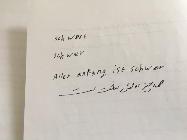Ein Akrostichon von Reza (Übergangsklasse), Teilnehmer des Workshops in der Internationalen Jugendbibliothek München (Leitung: Beate Schäfer und Tina Rausch). Reza hat auf Farsi geschrieben. Anders als in der deutschen Übersetzung hat er im Ursprungstext nicht den Begriff „Freund“, sondern den Begriff „Familie“ zugrunde gelegt:
