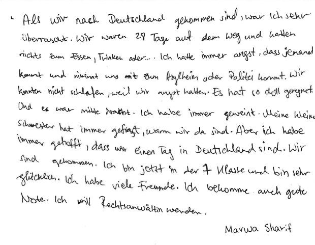 Weil in Afghanistan Krieg war. Und ich wollte lernen und leben, aber ich konnte es nicht. Jetzt lebe ich in Deutschland und ich kann alles: Lernen, spielen und leben.