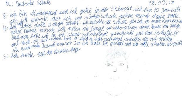 ich bin Mohammed und ich gehe in der 3 Klasse ich bin 10 Jare alt. als ich wusste das ich zur Schule gehen musste dann hatte. Ich hatte ganz dolle Angst gehabt. ich mustte zu Schule als ich in mein Klassenraum gehen musste musste ich neben ein Junge setzen dann kam ein Junge und dan habe ich im ein Kinder Schokolade geschenkt und dan lachelte er auf mich. im Hof-pause kam er und er hat gefrangt willts du mit spielen ich kan nicht Deutsch auser Ja ich habe Ja gesagt und wir alle haben gespielt. Ich freute auf den niesten tag.