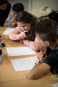Schreiben, Übersetzen und Miteinander-Sprechen gehen dabei Hand in Hand, und getreu dem Tandemprinzip gibt es neben Gruppengesprächen und stillen Schreibphasen immer wieder intensive Zeiten der Arbeit zu zweit. Schwer zu sagen, was das ist, wenn Sophie mit Antonio redet oder Reza und Sarah die Köpfe zusammenstecken. Wird hier gerade gemeinsam ins Deutsche übersetzt? Interviewen die deutschen Schülerinnen ihre Tandempartner, um mehr über deren Leben zu erfahren? Tauschen sie Familienerlebnisse aus?